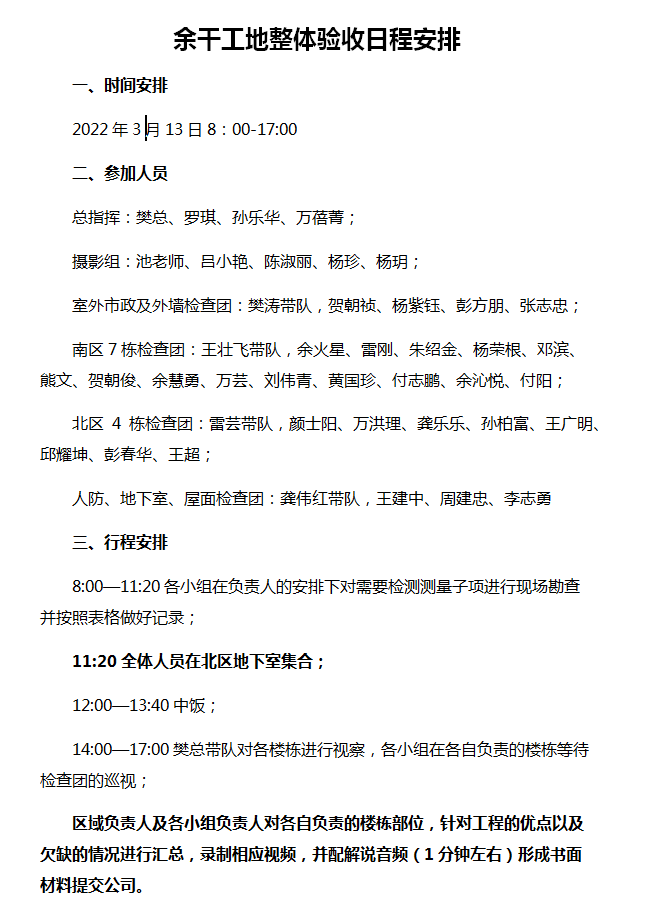 2022年3月13日, 公司领导层组织工程部全体员工赴余干项目学习考察,同时完成对该项目的整体验收,查缺补漏以指导安排好后期的交房工作。验收日具体安排如下: